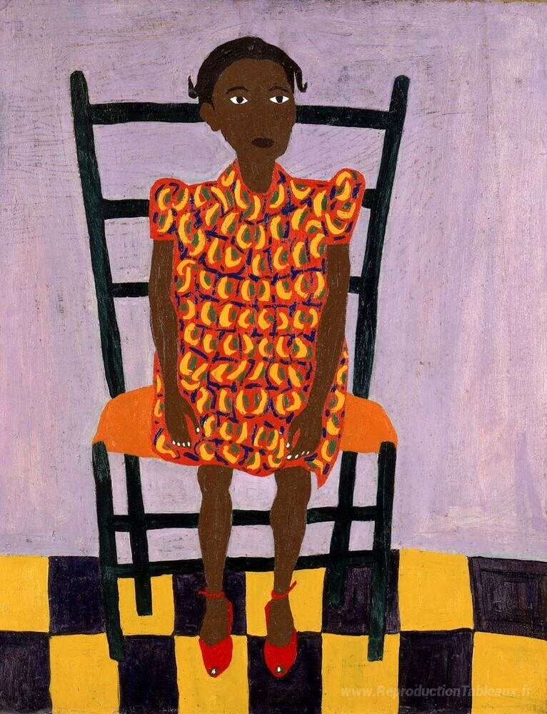 Nous vous proposons une reproduction artisanale sur toile du célèbre tableau 'Petite fille en orange' de William H. Johnson, provenant du Musée de la Reproduction.