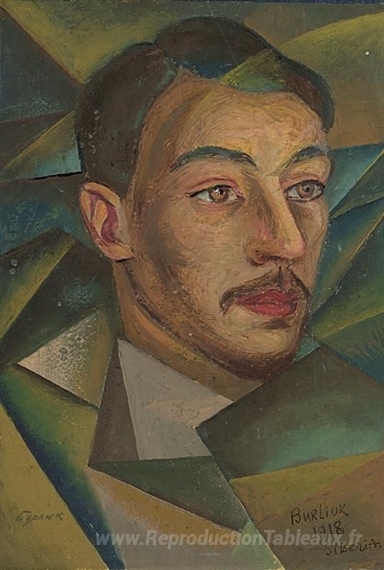 Nous vous proposons une reproduction artisanale sur toile du célèbre tableau 'Poète russe en Sibérie' de David Burliuk, provenant du Musée de la Reproduction.