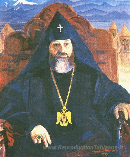 Découvrez l'élégance intemporelle des Portrait de Catholicos de tous les Arméniens Vazgen I, une œuvre magistrale du peintre arménien Martiros Saryan. Reconnu pour son style unique mêlant modernisme et influences traditionnelles, Saryan capture dans cette peinture une profondeur émotionnelle remarquable. Les couleurs vibrantes et les traits expressifs de ce portrait révèlent non seulement la personnalité du sujet, mais aussi l'essence de la culture arménienne, riche en histoire et en spiritualité.