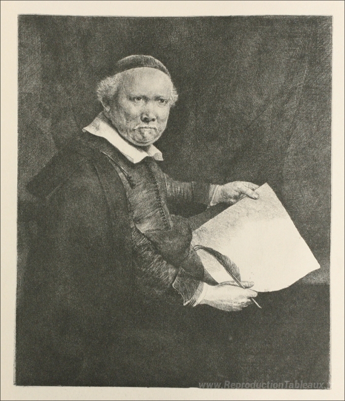 Nous vous proposons une reproduction artisanale sur toile du célèbre tableau 'Portrait de Coppenol' de Rembrandt, provenant du Musée de la Reproduction.