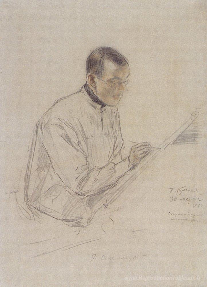 Nous vous proposons une reproduction artisanale sur toile du célèbre tableau 'Portrait de D.S. Stelletsky au travail' de Boris Kustodiev, provenant du Musée de la Reproduction.