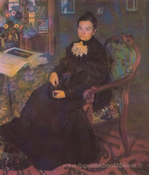 Nous vous proposons une reproduction artisanale sur toile du célèbre tableau 'Portrait de E.Kustodieva, mère de l'artiste' de Boris Kustodiev, provenant du Musée de la Reproduction.