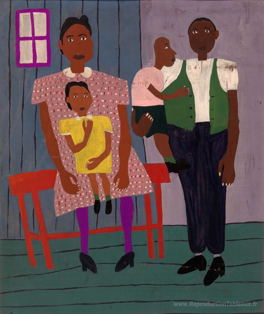 Nous vous proposons une reproduction artisanale sur toile du célèbre tableau 'Portrait de famille' de William H. Johnson, provenant du Musée de la Reproduction.