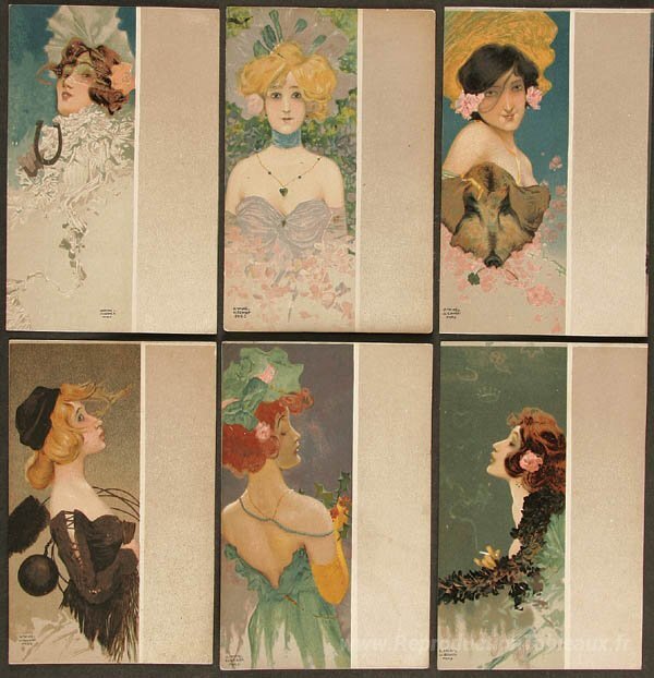 Nous vous proposons une reproduction artisanale sur toile du célèbre tableau 'Portrait de filles avec une bordure grise' de Raphael Kirchner, provenant du Musée de la Reproduction.