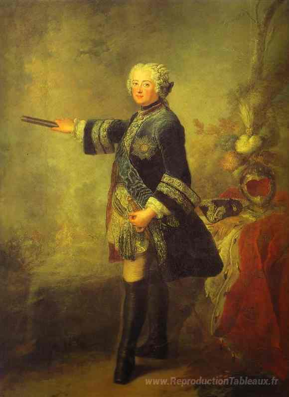 Nous vous proposons une reproduction artisanale sur toile du célèbre tableau 'Portrait de Frederick II' de Antoine Pesne, provenant du Musée de la Reproduction.