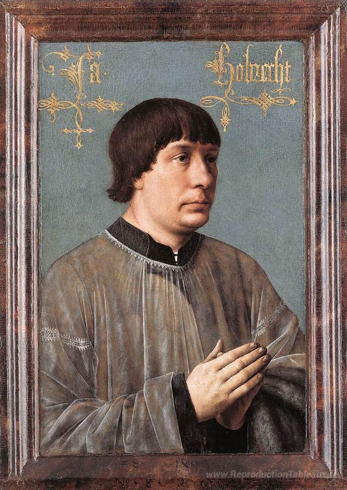 Nous vous proposons une reproduction artisanale sur toile du célèbre tableau 'Portrait de Jacob Obrecht' de Hans Memling, provenant du Musée de la Reproduction.