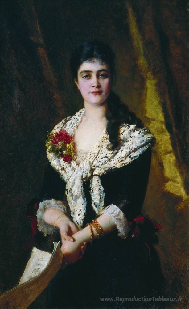 Nous vous proposons une reproduction artisanale sur toile du célèbre tableau 'Portrait de la chanteuse d'opéra russe Sandra Panava' de Konstantin Makovsky, provenant du Musée de la Reproduction.