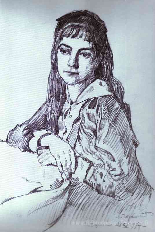 Nous vous proposons une reproduction artisanale sur toile du célèbre tableau 'Portrait de la fille de l'artiste, Vera' de Mstislav Dobuzhinsky, provenant du Musée de la Reproduction.