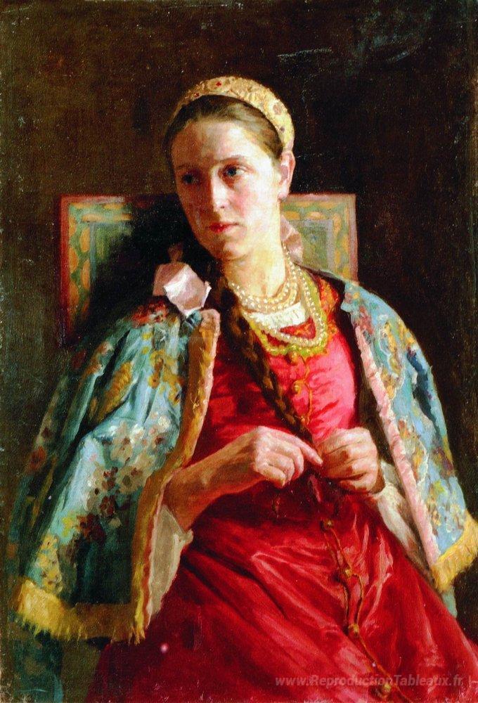 Nous vous proposons une reproduction artisanale sur toile du célèbre tableau 'Portrait de la jeune femme en costume russe' de Konstantin Makovsky, provenant du Musée de la Reproduction.