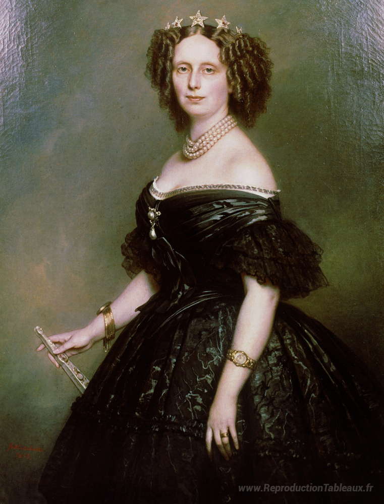 Nous vous proposons une reproduction artisanale sur toile du célèbre tableau 'Portrait de la reine Sophie des Pays-Bas, née Sophie de Württemb' de Franz Xaver Winterhalter, provenant du Musée de la Reproduction.
