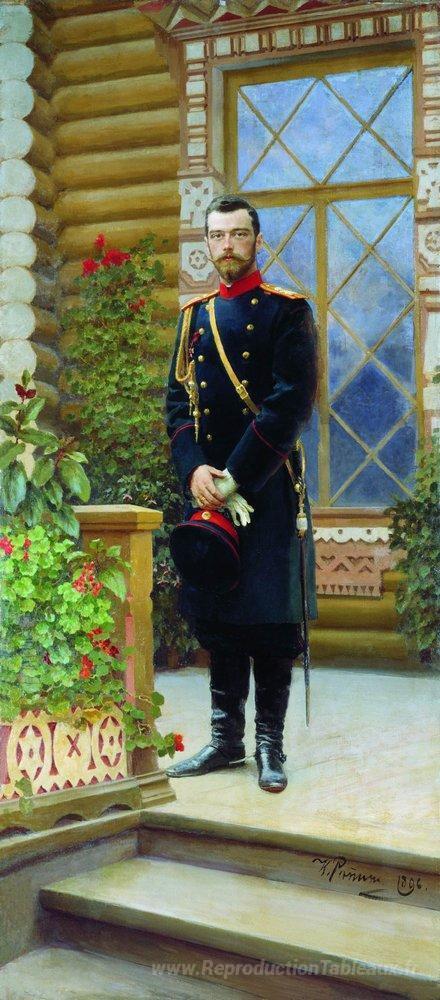 Nous vous proposons une reproduction artisanale sur toile du célèbre tableau 'Portrait de l'empereur Nicholas II sur le porche' de Ilya Repin, provenant du Musée de la Reproduction.