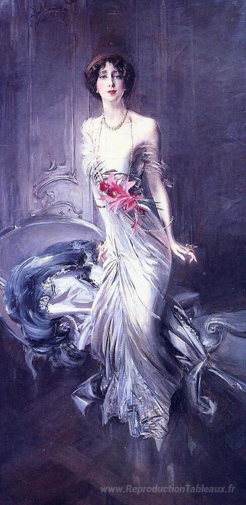 Nous vous proposons une reproduction artisanale sur toile du célèbre tableau 'Portrait de Madame E. L. Doyen' de Giovanni Boldini, provenant du Musée de la Reproduction.