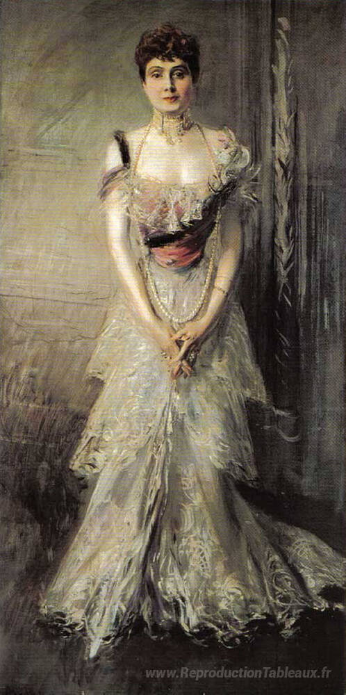 Nous vous proposons une reproduction artisanale sur toile du célèbre tableau 'Portrait de Maria Eulalia d'Espagne' de Giovanni Boldini, provenant du Musée de la Reproduction.