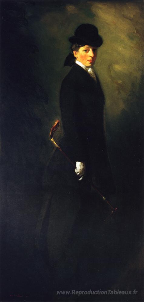 Nous vous proposons une reproduction artisanale sur toile du célèbre tableau 'Portrait de Miss Leora Dryer en costume de conduite' de Robert Henri, provenant du Musée de la Reproduction.