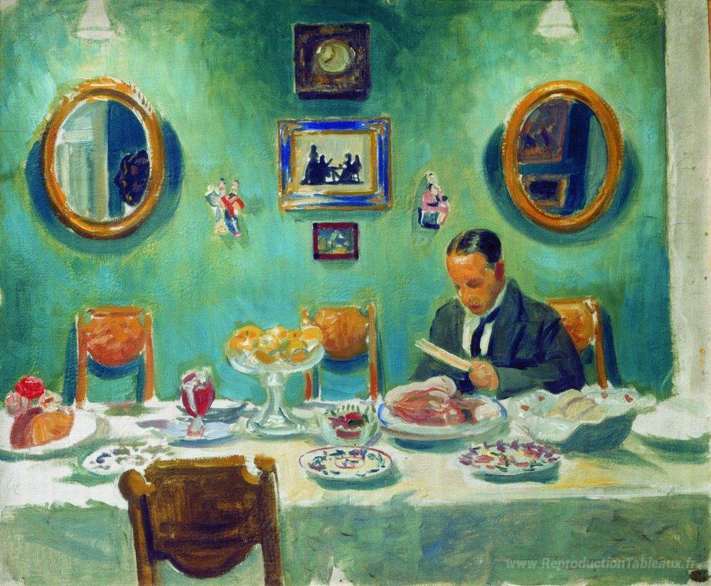 Nous vous proposons une reproduction artisanale sur toile du célèbre tableau 'Portrait de M.V. Dobuzhinsky à la table' de Boris Kustodiev, provenant du Musée de la Reproduction.