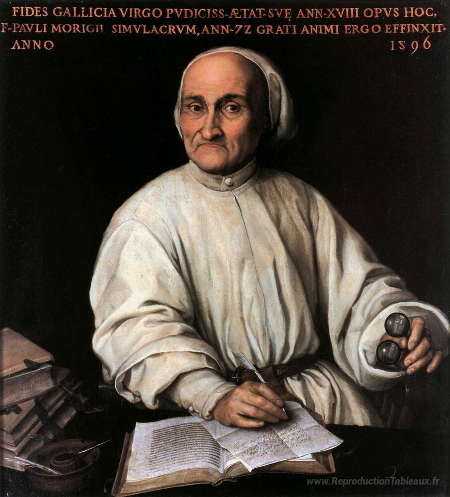 Nous vous proposons une reproduction artisanale sur toile du célèbre tableau 'Portrait de Paolo Morigia' de Fede Galizia, provenant du Musée de la Reproduction.