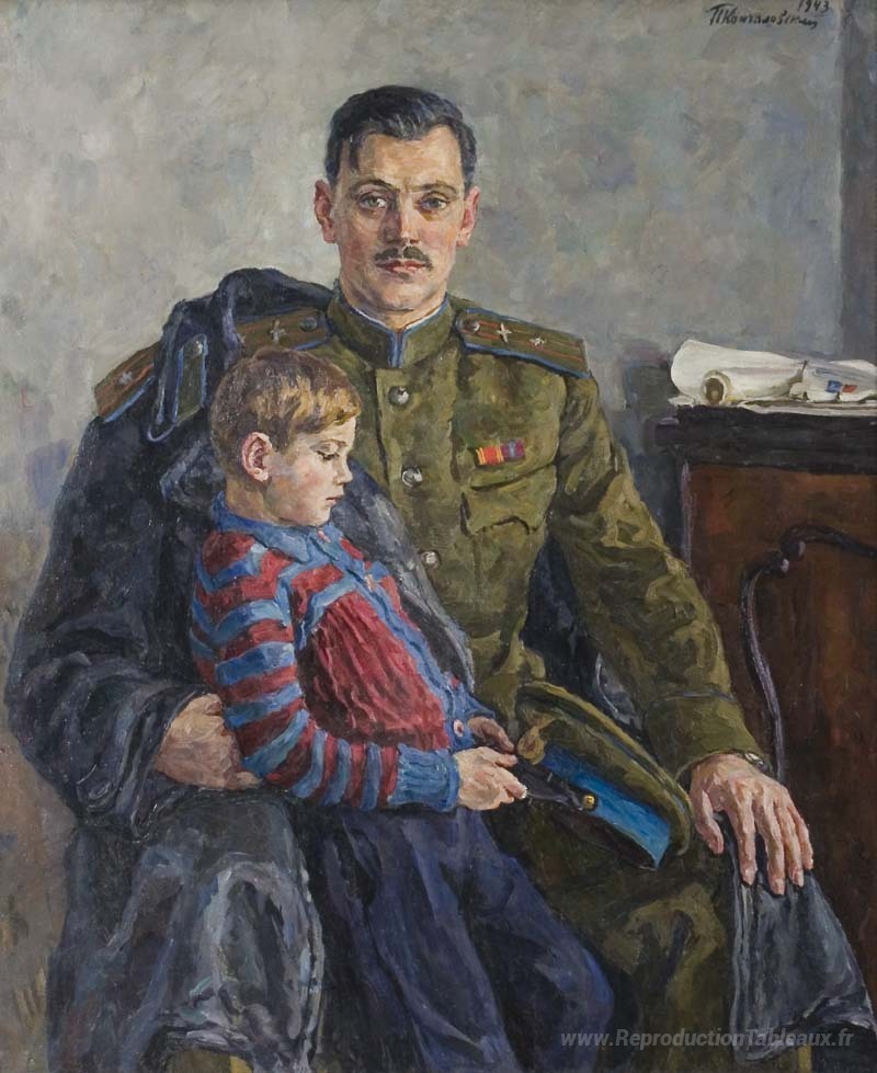 Nous vous proposons une reproduction artisanale sur toile du célèbre tableau 'Portrait de Sergei Vladimirovich Mikhalkov avec son fils' de Pyotr Konchalovsky, provenant du Musée de la Reproduction.
