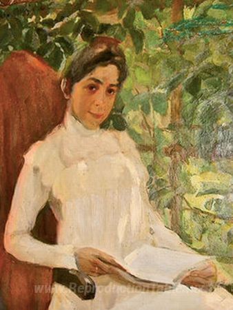 Nous vous proposons une reproduction artisanale sur toile du célèbre tableau 'Portrait de Z.A. Pertsova' de Konstantin Yuon, provenant du Musée de la Reproduction.