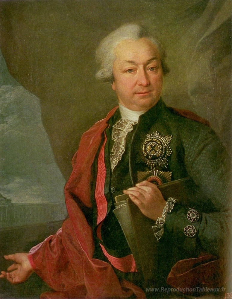 Nous vous proposons une reproduction artisanale sur toile du célèbre tableau 'Portrait d'Ivan Ivanovich Shuvalov' de Dmitry Levitzky, provenant du Musée de la Reproduction.