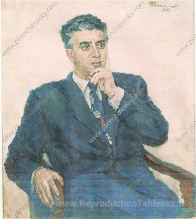 Nous vous proposons une reproduction artisanale sur toile du célèbre tableau 'Portrait du compositeur Aram Khachaturian' de Pyotr Konchalovsky, provenant du Musée de la Reproduction.