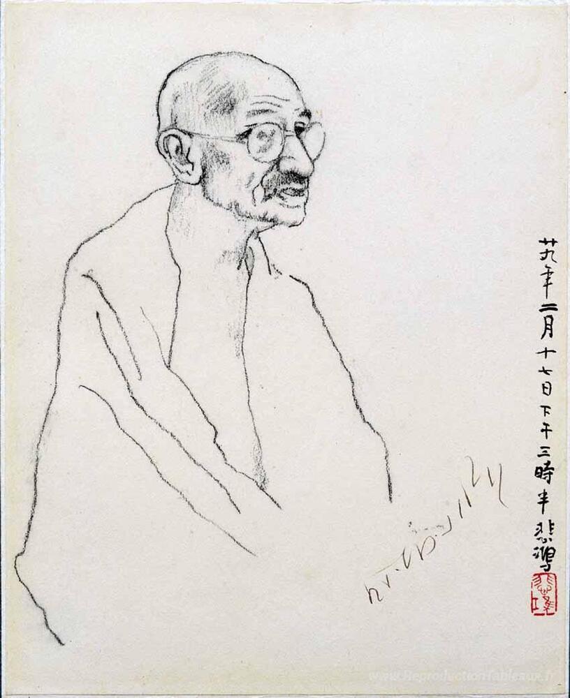 Nous vous proposons une reproduction artisanale sur toile du célèbre tableau 'Portrait du Mahatma Gandhi' de Xu Beihong, provenant du Musée de la Reproduction.