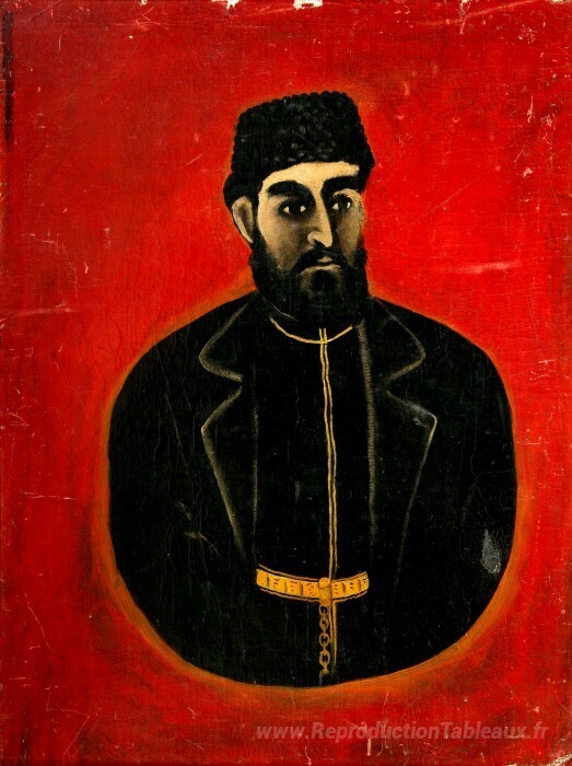 Nous vous proposons une reproduction artisanale sur toile du célèbre tableau 'Portrait du propriétaire de la vins sur un fond rouge' de Niko Pirosmani, provenant du Musée de la Reproduction.