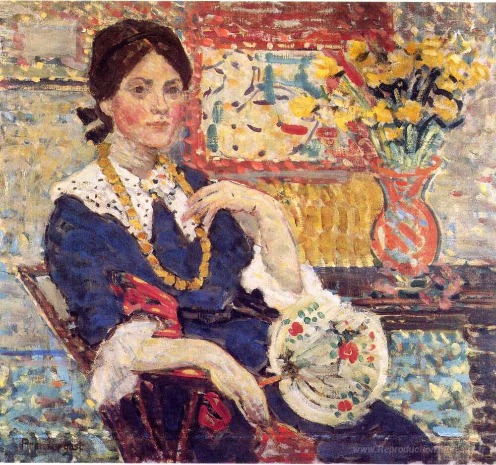 Nous vous proposons une reproduction artisanale sur toile du célèbre tableau 'Portrait du Rouge de Mlle Edith King' de Maurice Prendergast, provenant du Musée de la Reproduction.