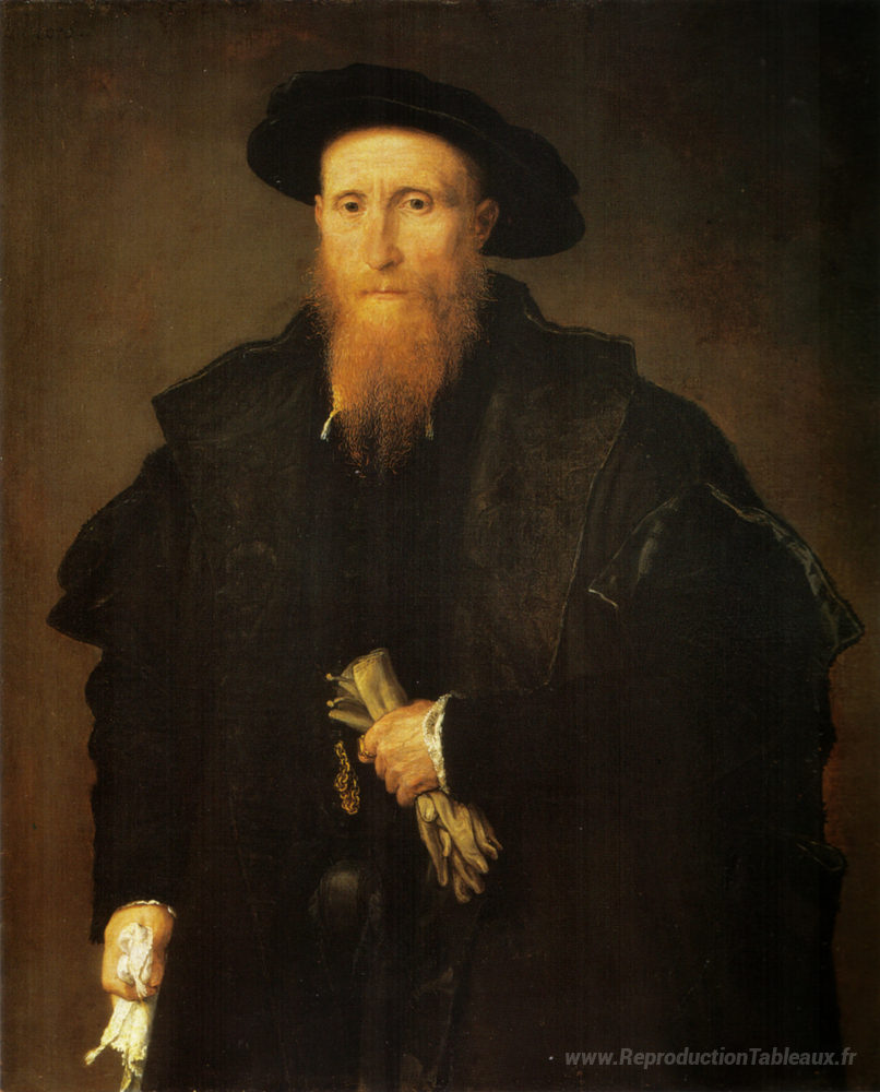 Nous vous proposons une reproduction artisanale sur toile du célèbre tableau 'Portrait d'un gentleman avec des gants' de Lorenzo Lotto, provenant du Musée de la Reproduction.