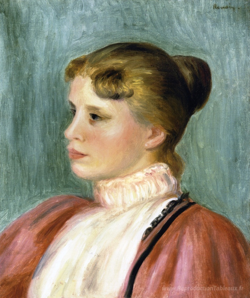 Nous vous proposons une reproduction artisanale sur toile du célèbre tableau 'Portrait d'une femme' de Pierre-Auguste Renoir, provenant du Musée de la Reproduction.