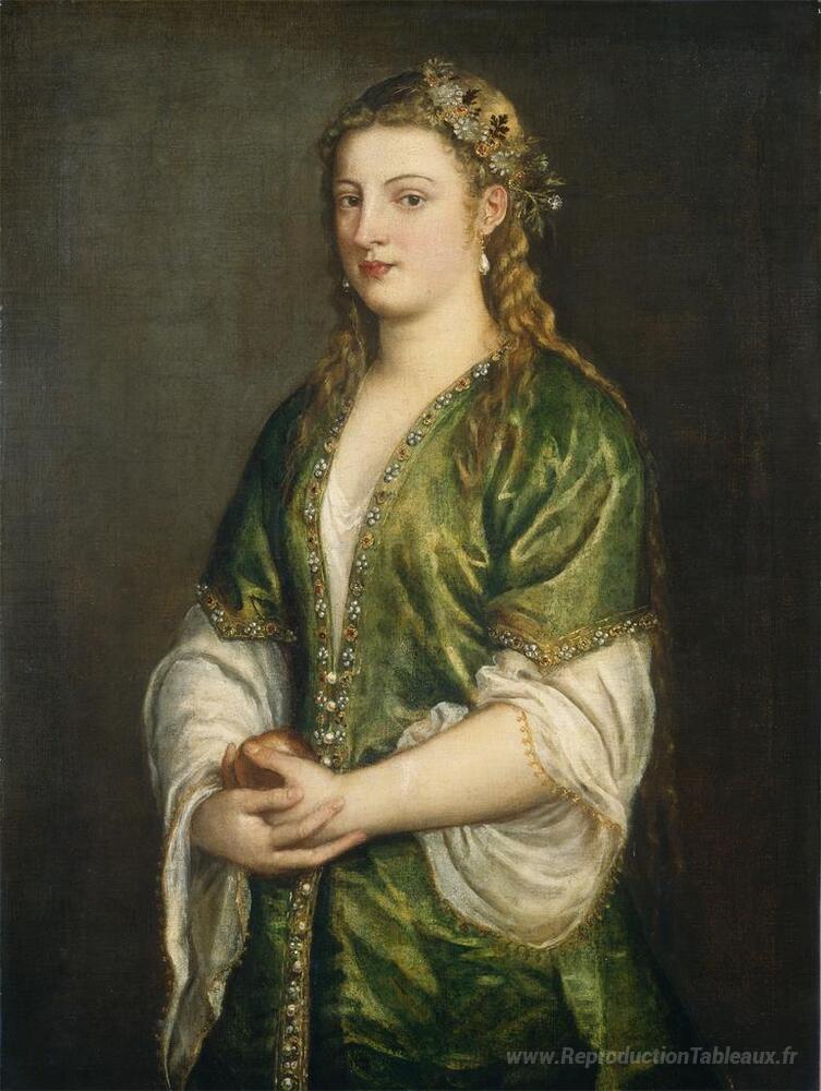 Nous vous proposons une reproduction artisanale sur toile du célèbre tableau 'Portrait d'une femme' de Titian, provenant du Musée de la Reproduction.