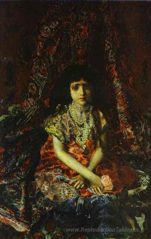 Nous vous proposons une reproduction artisanale sur toile du célèbre tableau 'Portrait d'une fille contre un tapis persan' de Mikhail Vrubel, provenant du Musée de la Reproduction.