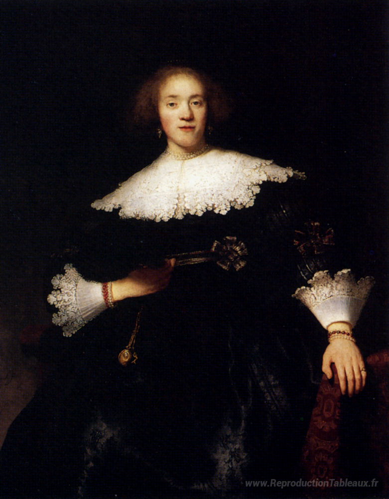 Nous vous proposons une reproduction artisanale sur toile du célèbre tableau 'Portrait d'une jeune femme avec un fan' de Rembrandt, provenant du Musée de la Reproduction.
