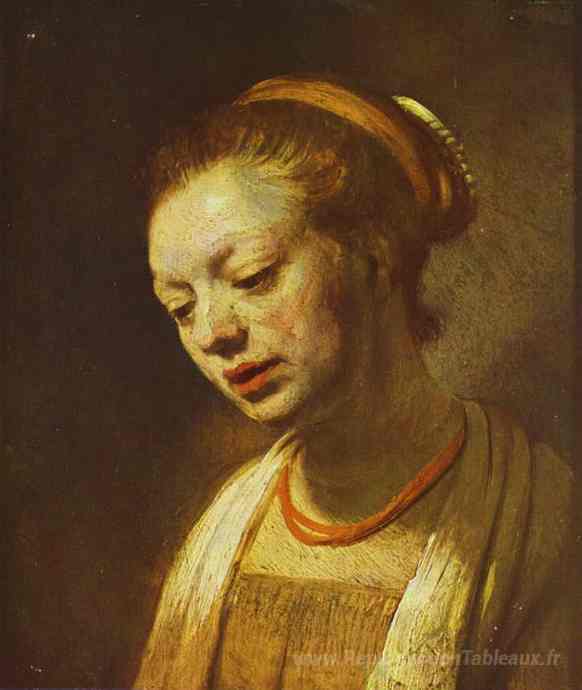 Nous vous proposons une reproduction artisanale sur toile du célèbre tableau 'Portrait d'une jeune fille' de Rembrandt, provenant du Musée de la Reproduction.
