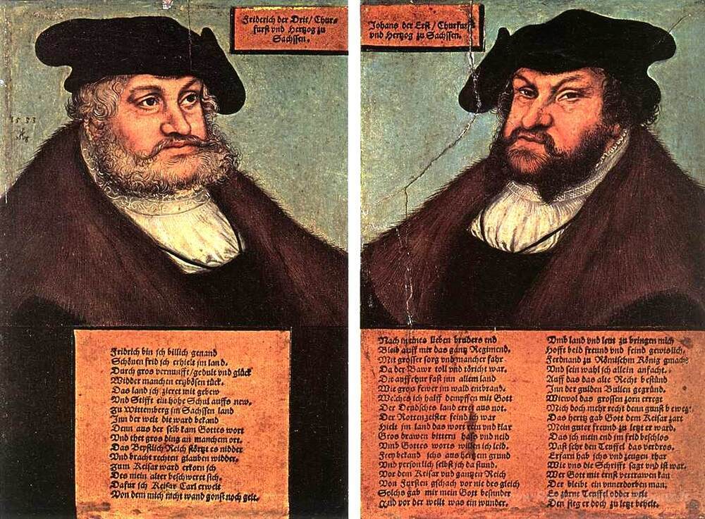 Nous vous proposons une reproduction artisanale sur toile du célèbre tableau 'Portraits de Johann I et Frederick III les sages, électeurs de s' de Lucas Cranach the Elder, provenant du Musée de la Reproduction.