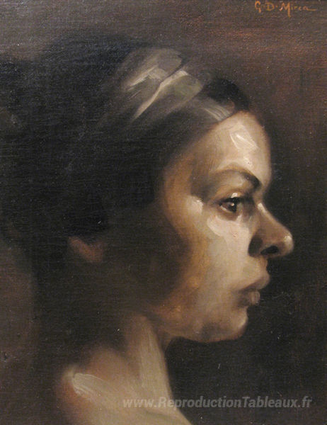 Nous vous proposons une reproduction artisanale sur toile du célèbre tableau 'Profil de femme' de George Demetrescu Mirea, provenant du Musée de la Reproduction.