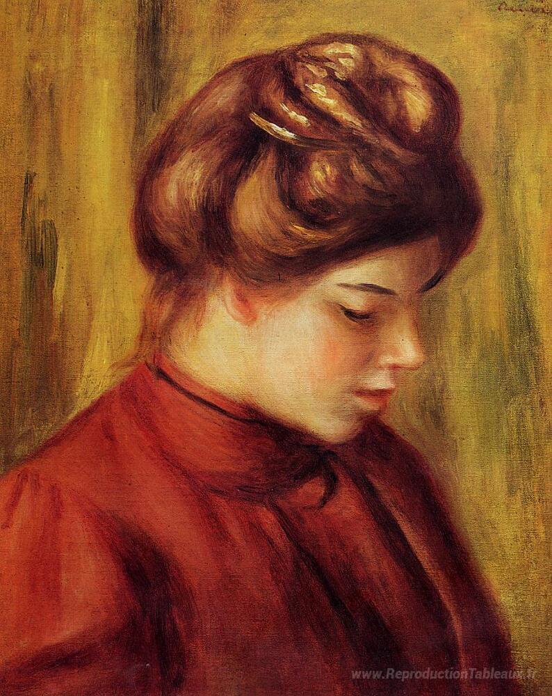 Nous vous proposons une reproduction artisanale sur toile du célèbre tableau 'Profil d'une femme dans un chemisier rouge' de Pierre-Auguste Renoir, provenant du Musée de la Reproduction.
