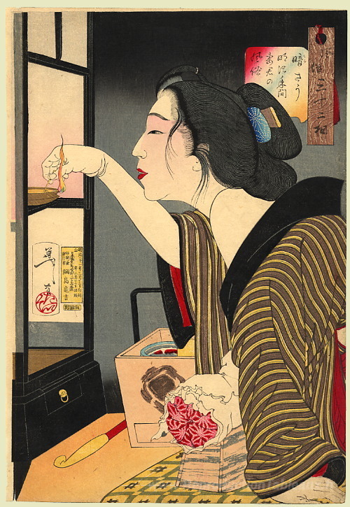 Nous vous proposons une reproduction artisanale sur toile du célèbre tableau 'Regarde sombre - l'apparence d'une femme pendant l'ère Meiji' de Tsukioka Yoshitoshi, provenant du Musée de la Reproduction.