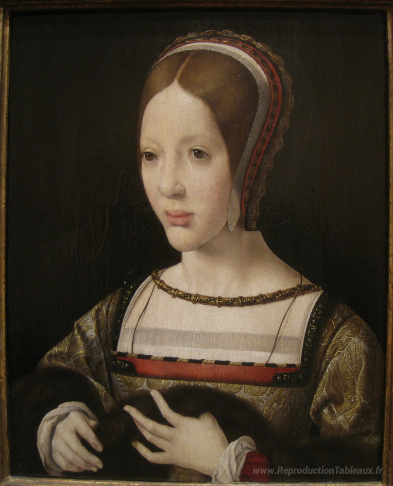 Nous vous proposons une reproduction artisanale sur toile du célèbre tableau 'Reine Eleanor d'Autriche' de Mabuse, provenant du Musée de la Reproduction.