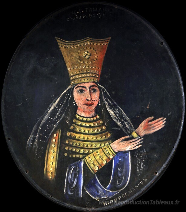 Nous vous proposons une reproduction artisanale sur toile du célèbre tableau 'Reine Tamar' de Niko Pirosmani, provenant du Musée de la Reproduction.