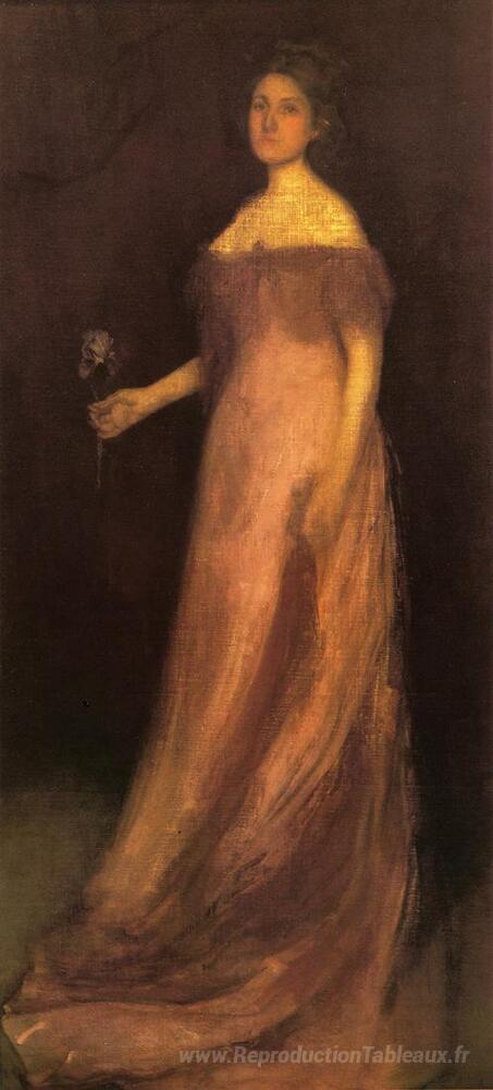 Nous vous proposons une reproduction artisanale sur toile du célèbre tableau 'Rose et vert: l'iris - Portrait de Miss Kinsella' de James McNeill Whistler, provenant du Musée de la Reproduction.