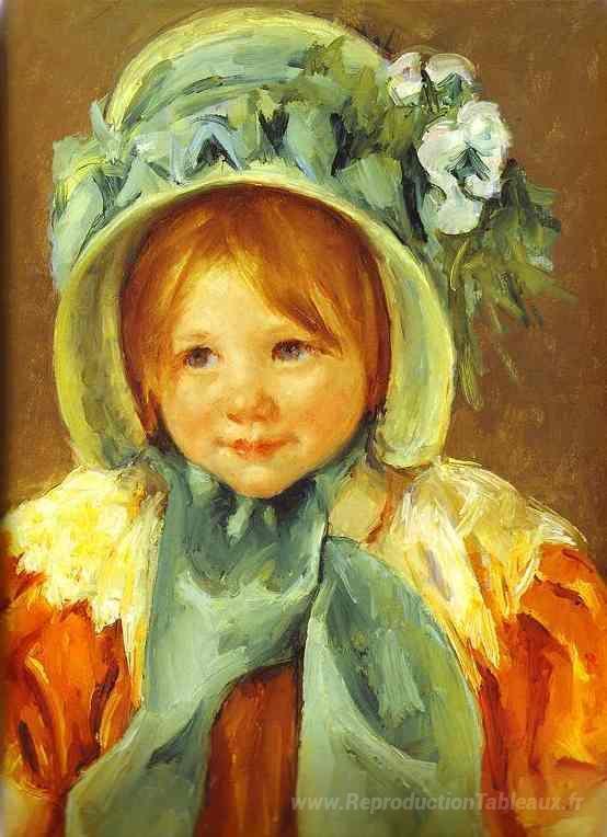 Nous vous proposons une reproduction artisanale sur toile du célèbre tableau 'Sarah dans un capot vert' de Mary Cassatt, provenant du Musée de la Reproduction.