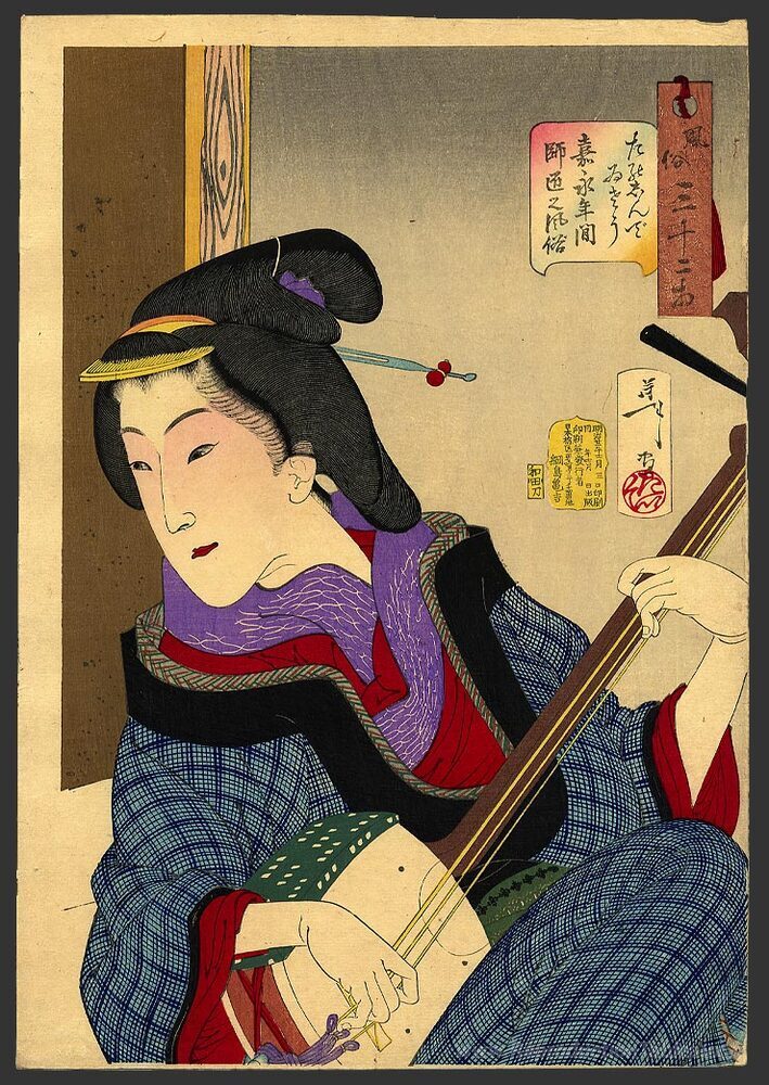 Nous vous proposons une reproduction artisanale sur toile du célèbre tableau 'Semble qu'elle s'amuse - une enseignante de l'ère Keisei' de Tsukioka Yoshitoshi, provenant du Musée de la Reproduction.
