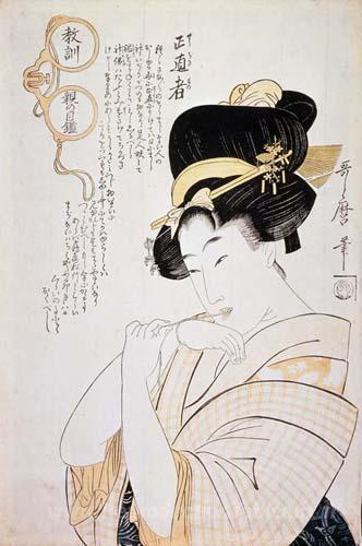 Nous vous proposons une reproduction artisanale sur toile du célèbre tableau 'Sur mon serment' de Kitagawa Utamaro, provenant du Musée de la Reproduction.