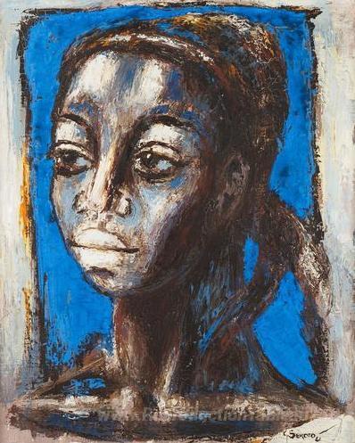 Nous vous proposons une reproduction artisanale sur toile du célèbre tableau 'Tête bleue' de Gerard Sekoto, provenant du Musée de la Reproduction.