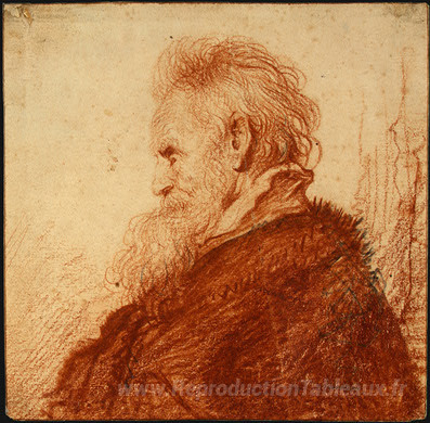 Nous vous proposons une reproduction artisanale sur toile du célèbre tableau 'Tête d'un vieil homme' de Rembrandt, provenant du Musée de la Reproduction.