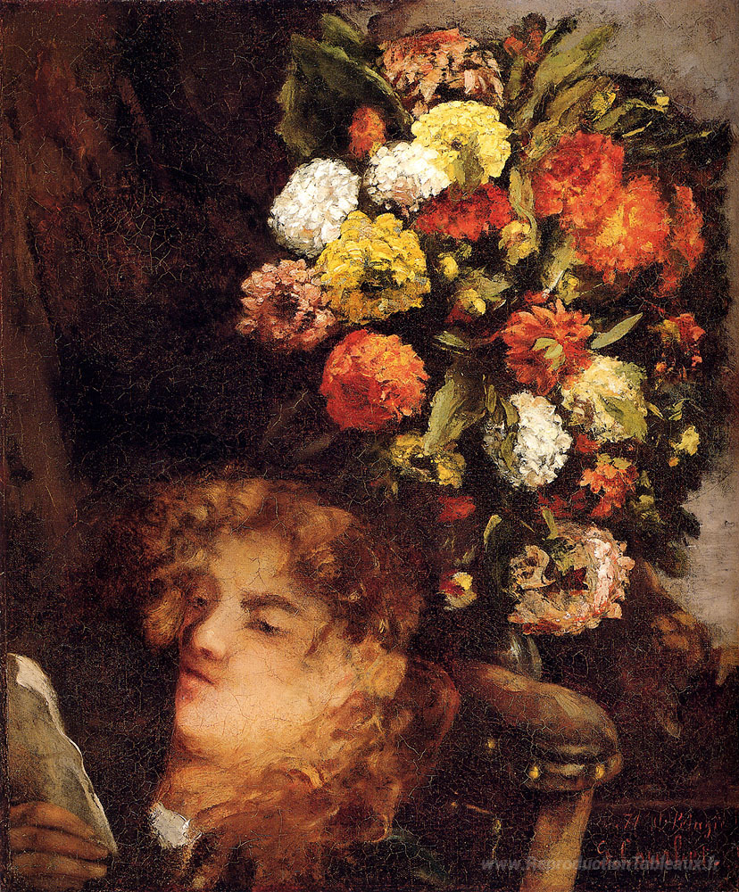 Nous vous proposons une reproduction artisanale sur toile du célèbre tableau 'Tête d'une femme avec des fleurs' de Gustave Courbet, provenant du Musée de la Reproduction.