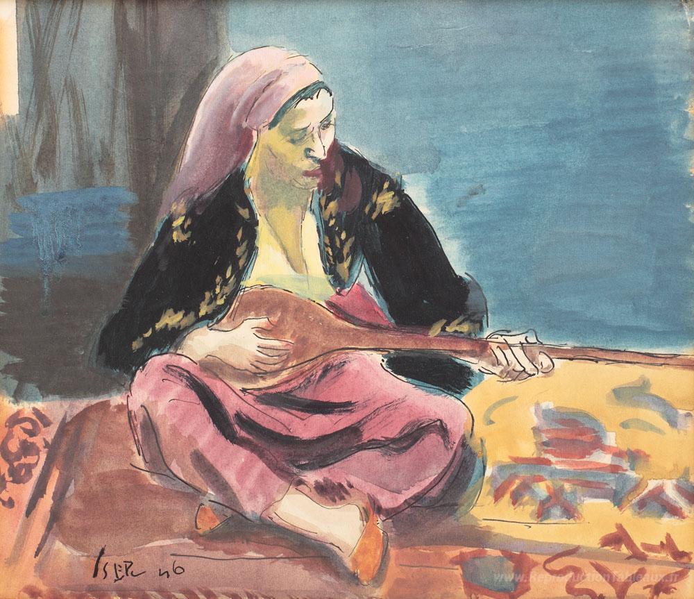 Nous vous proposons une reproduction artisanale sur toile du célèbre tableau 'Tatar avec mandoline' de Iosif Iser, provenant du Musée de la Reproduction.