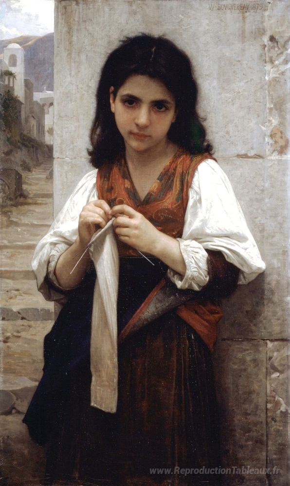 Nous vous proposons une reproduction artisanale sur toile du célèbre tableau 'Tricot' de William-Adolphe Bouguereau, provenant du Musée de la Reproduction.