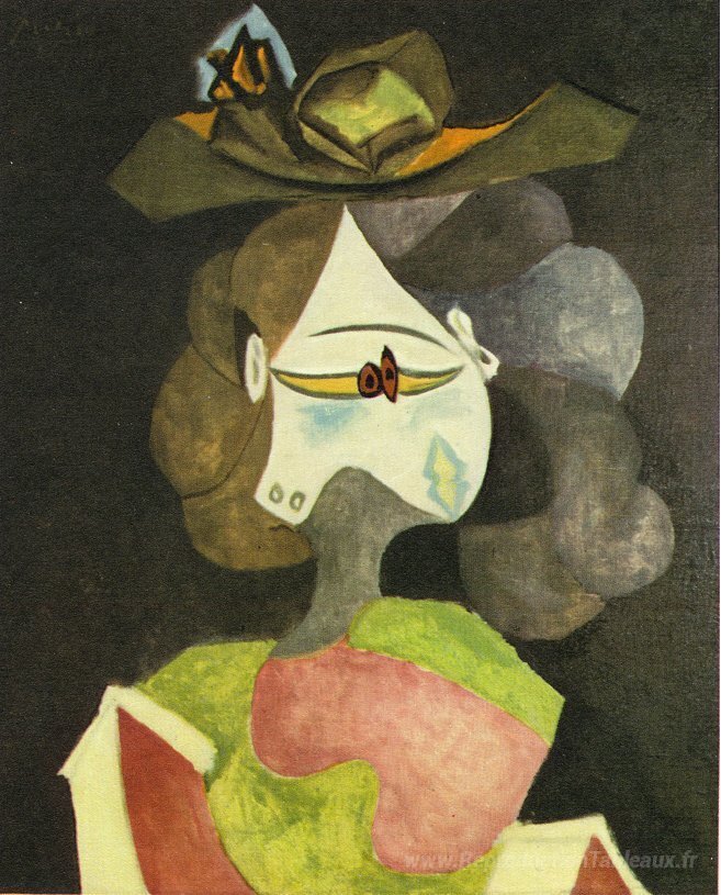 Nous vous proposons une reproduction artisanale sur toile du célèbre tableau 'Un chapeau avec des fleurs' de Pablo Picasso, provenant du Musée de la Reproduction.