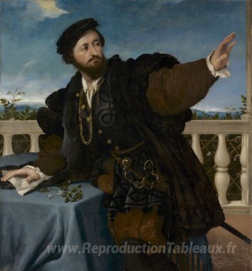 Nous vous proposons une reproduction artisanale sur toile du célèbre tableau 'Un noble sur un balcon' de Lorenzo Lotto, provenant du Musée de la Reproduction.